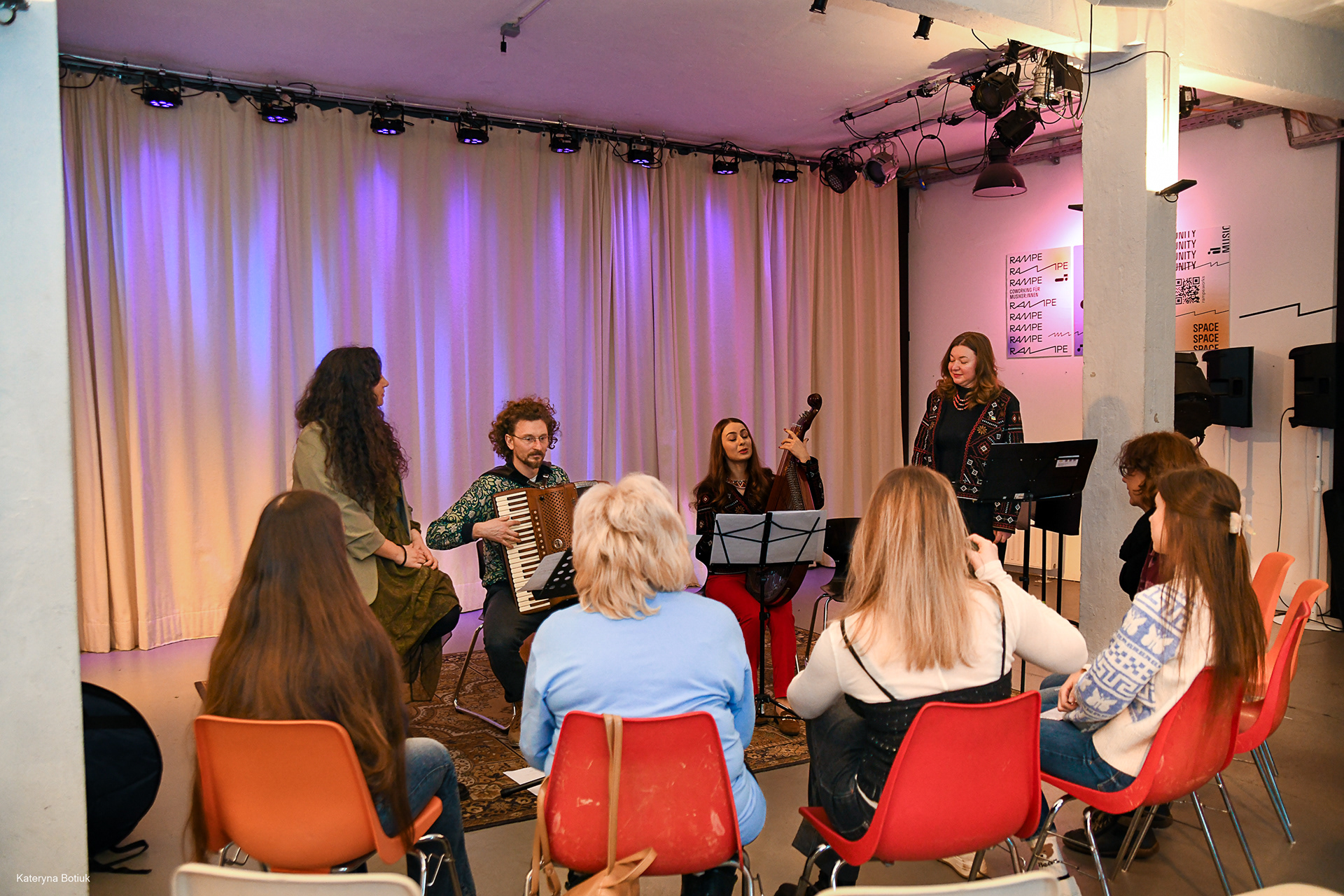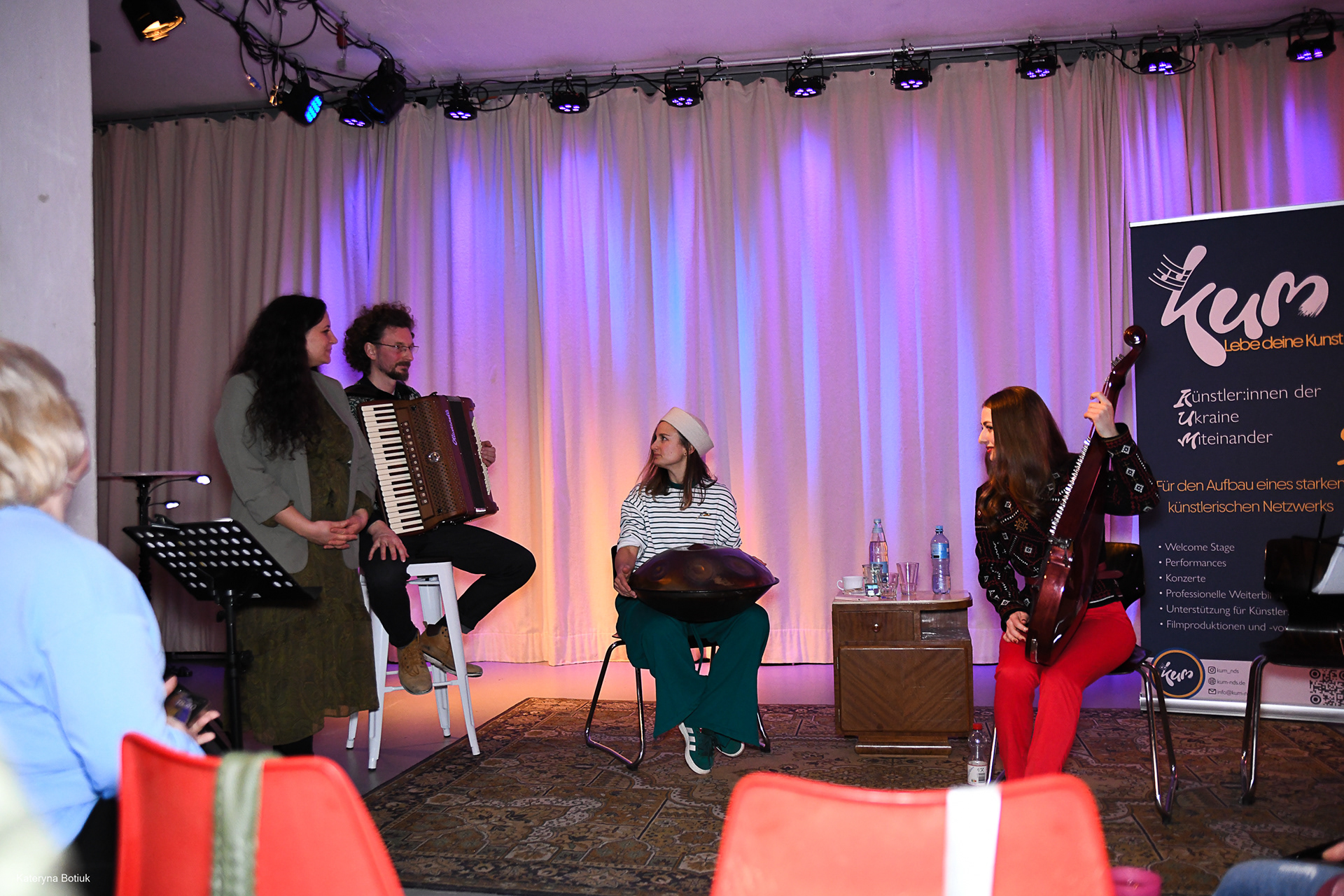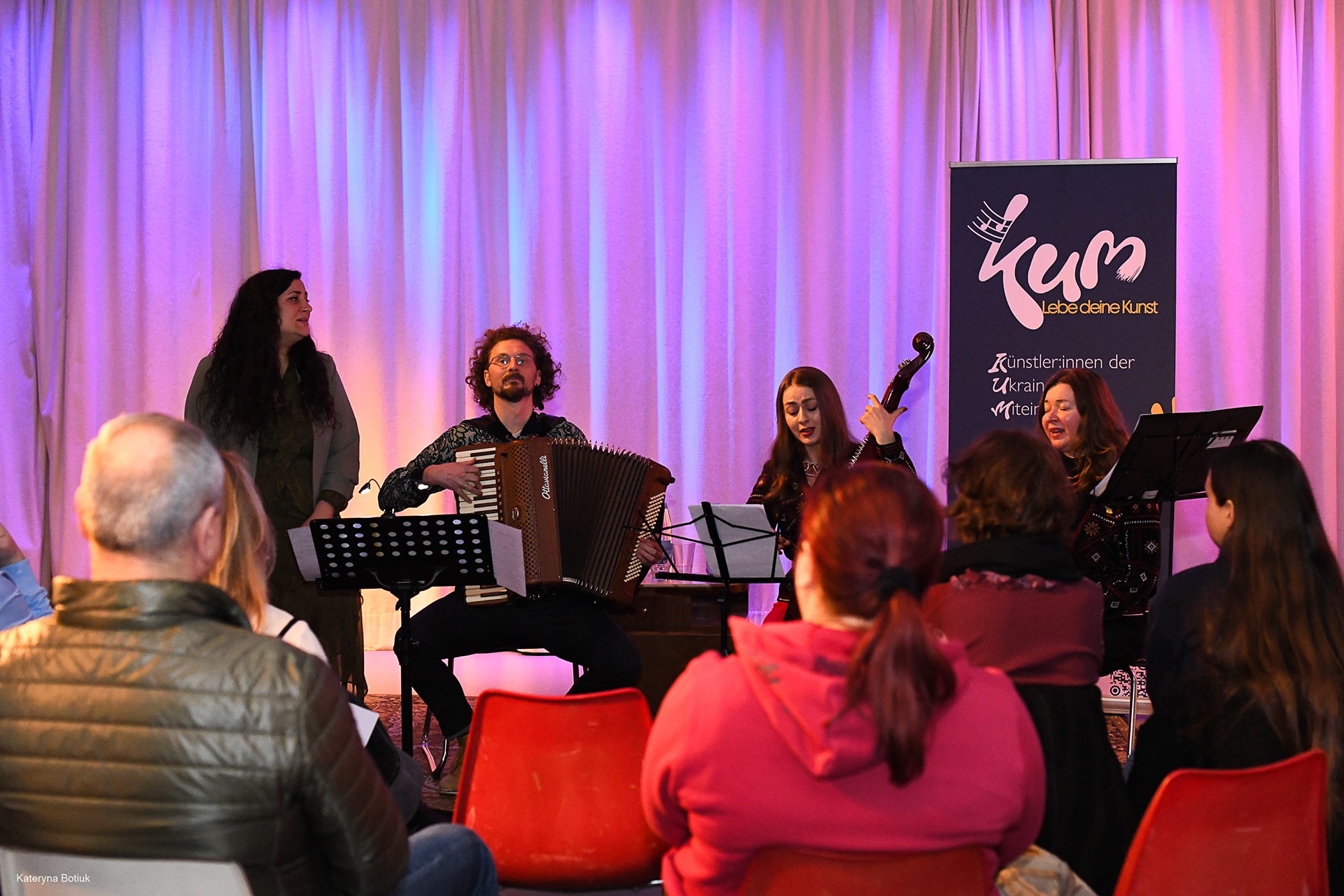 Das Konzert am 2. März 2025 war eine tief berührende Begegnung zweier musikalischer Welten. Das Duo Malikì (Chiara Raimondi, Stimme und Markus Korda, Akkordeon) lud die ukrainischen Musikerinnen Anna und Svitlana Sonyk ein, um gemeinsam ein Programm zu gestalten, das weit über bloße Unterhaltung hinausging.